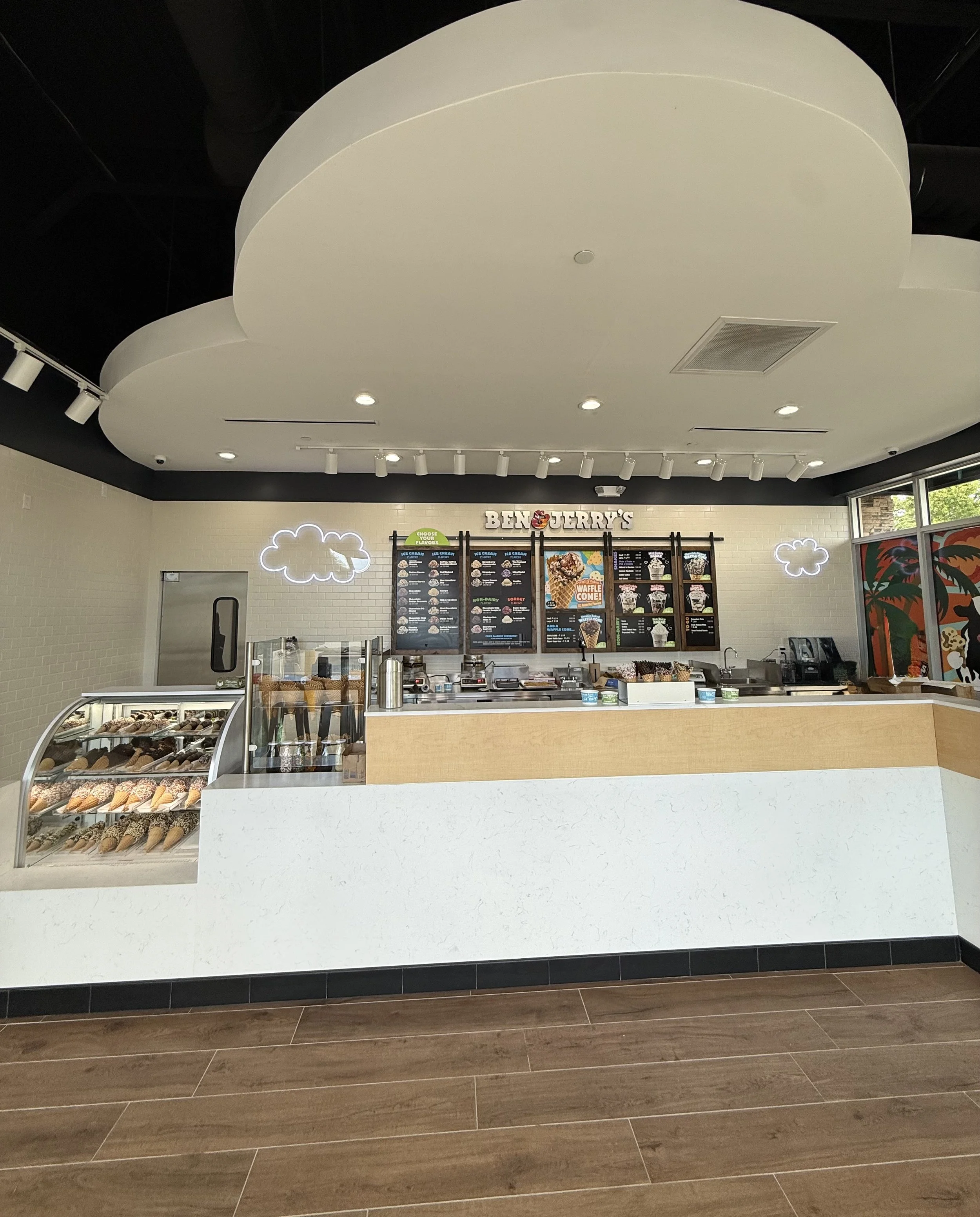 Constant Construction Group proudly completed the interior build-out of Ben & Jerry’s at Riverbend Marketplace in Fort Lauderdale, transforming a newly constructed shell space into a vibrant, fully branded ice cream shop. Working alongside corporate representatives and design partners, our team delivered a turnkey construction package aligned with Ben & Jerry’s national design standards and the Florida Building Code.